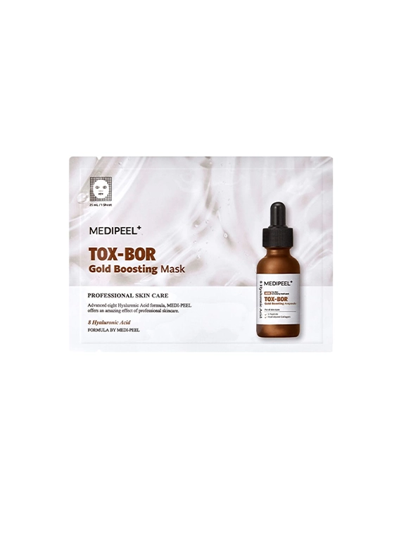 MEDIPEEL Tox-Bor Gold Boosting Mask – ваш секрет до пружної та сяючої шкіри. Ця живильна маска, збагачена чистим 24-каратним золотом (99,9%), створена для миттєвого відновлення еластичності, глибокого зволоження та усунення ознак втоми. Поєднуючи інноваційні інгредієнти, такі як екстракт кореня чебрецю, колаген і 8 шарів гіалуронової кислоти, вона забезпечує інтенсивний догляд, даруючи шкірі розкішне перетворення вже після першого застосування.
